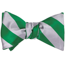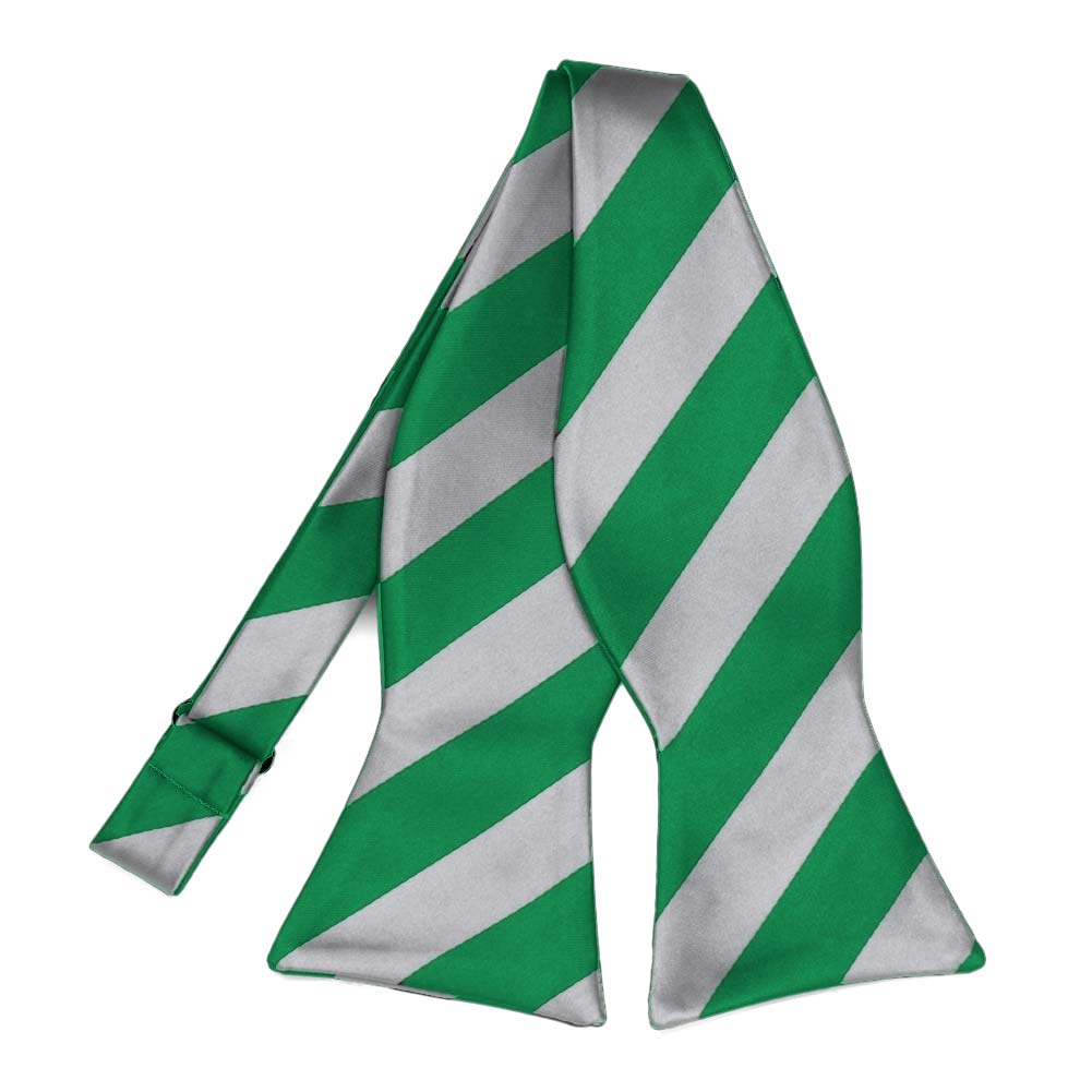 This classic kelly green and silver striped self-tie bow tie measures approximately 4-inches across by 2.5-inches high when tied. The adjustable neck fits sizes from 13.75 to 18-inches. Made from all polyester microfiber, it is designed to match our bestselling men's kelly green and silver striped tie. Matching pocket squares are available for purchase.