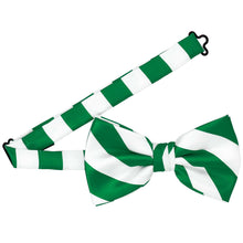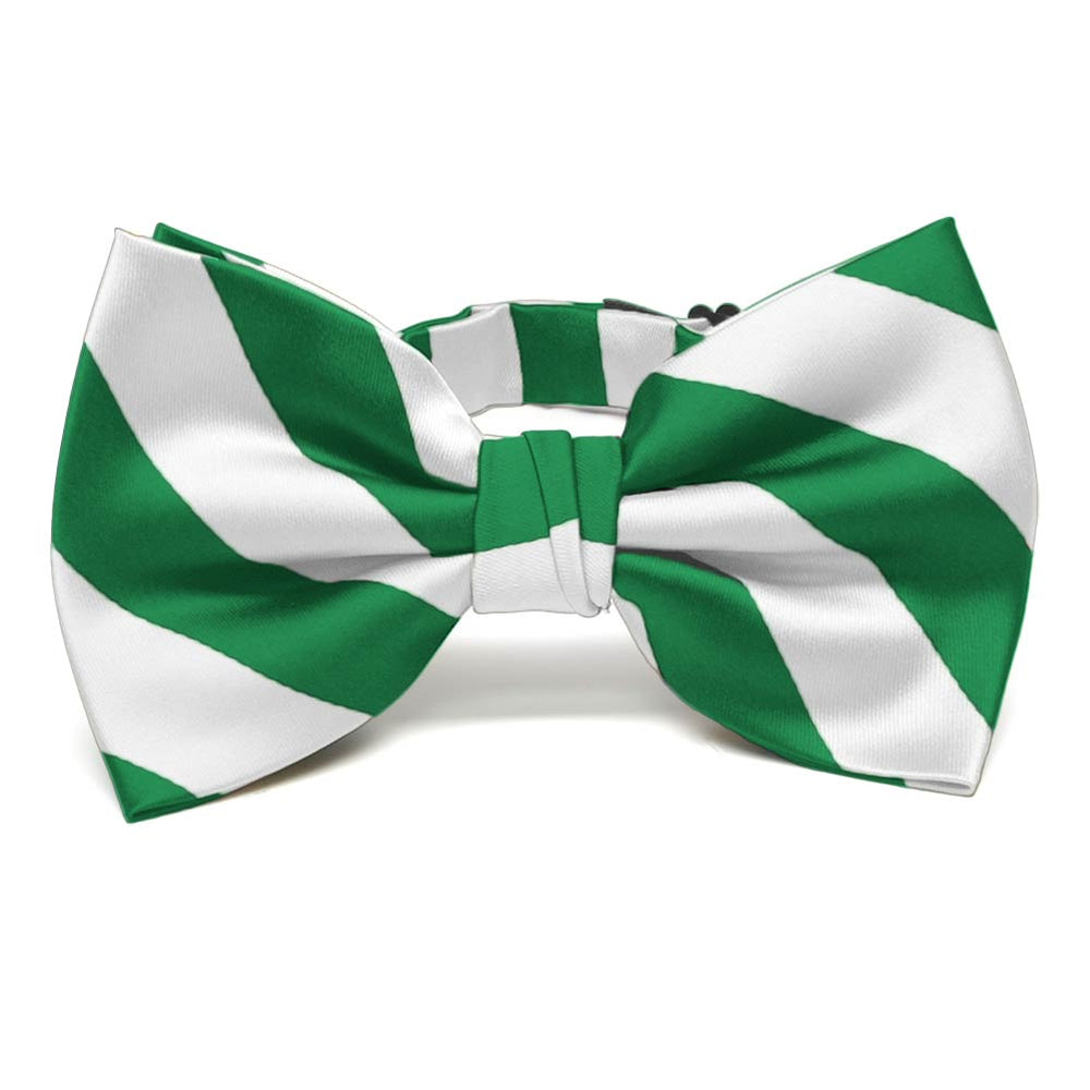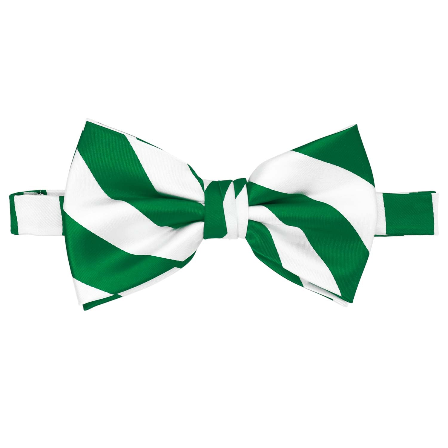 This kelly green and white striped bow tie features a pre-tied, band collar that expands to fit neck sizes up to 19-inches. Made from all polyester microfiber, it is designed to match our kelly green and white striped pocket squares (sold separately).