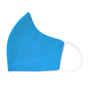 This bright blue reusable face mask is sized to fit children between the ages of 2 and 10-years old. (Do not use a face mask on a child younger than 2-years old. For most kids over 10 we suggest our adult size masks.) The mask is made from three layers of lightweight, all-cotton material. Two of the layers are solid material extending the full length of the mask. The third layer is on the inside (closest to the child's face when worn) and extends over 80% of the mask. This layer has an opening at one end which serves as a pocket to easily place an additional filter of your choice. (A filter is not included.) This face mask is breathable with comfortable ear loops, no tying required. The outside layer is bright blue and the inside layer and ear loops are white.