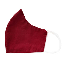 This burgundy reusable face mask is sized to fit children between the ages of 2 and 10-years old. (Do not use a face mask on a child younger than 2-years old. For most kids over 10 we suggest our adult size masks.) The mask is made from three layers of lightweight, all-cotton material. Two of the layers are solid material extending the full length of the mask. The third layer is on the inside (closest to the child's face when worn) and extends over 80% of the mask. This layer has an opening at one end which serves as a pocket to easily place an additional filter of your choice. (A filter is not included.) This face mask is breathable with comfortable ear loops, no tying required. The outside layer is burgundy and the inside layer and ear loops are white.