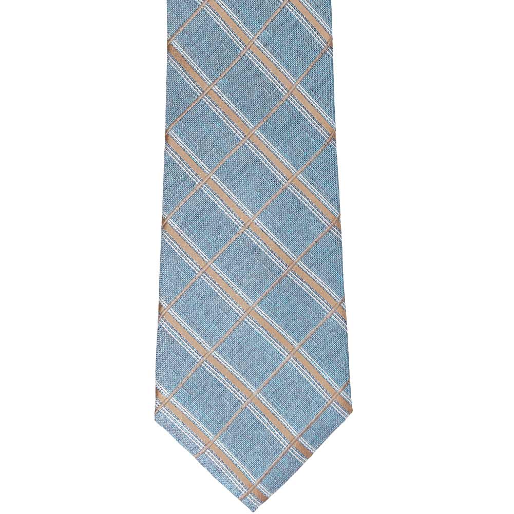 This down-to-earth tie gives off western vibes with its denim blue plaid-like design. The criss-crossing champagne details dress up the tie just enough to make it office or wedding appropriate. They say denim goes with everything, but we personally like this tie with a navy blue suit.