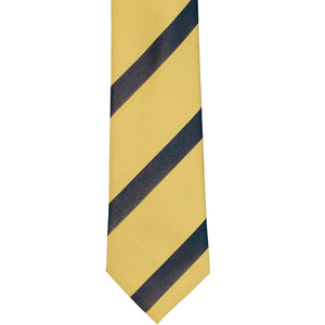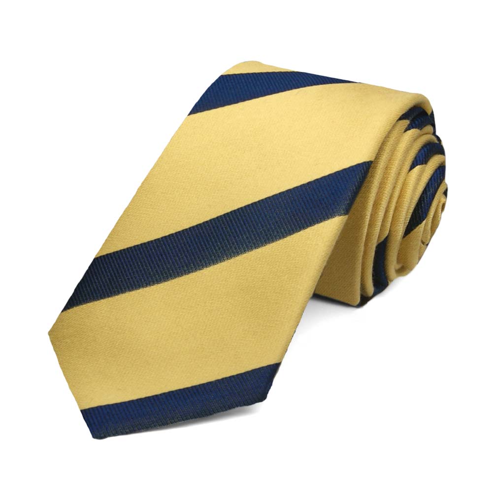 Take your outfit to the next level in stripes. The light gold and navy blue combination is sophisticated and trendy while the tie itself is modern in a slim width. Look again at those stripes. The wider ones have a smooth finish and the smaller ones are ribbed. Heading to school or the office? Great! Wear it with slacks or a suit.
