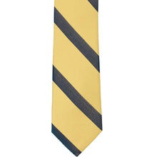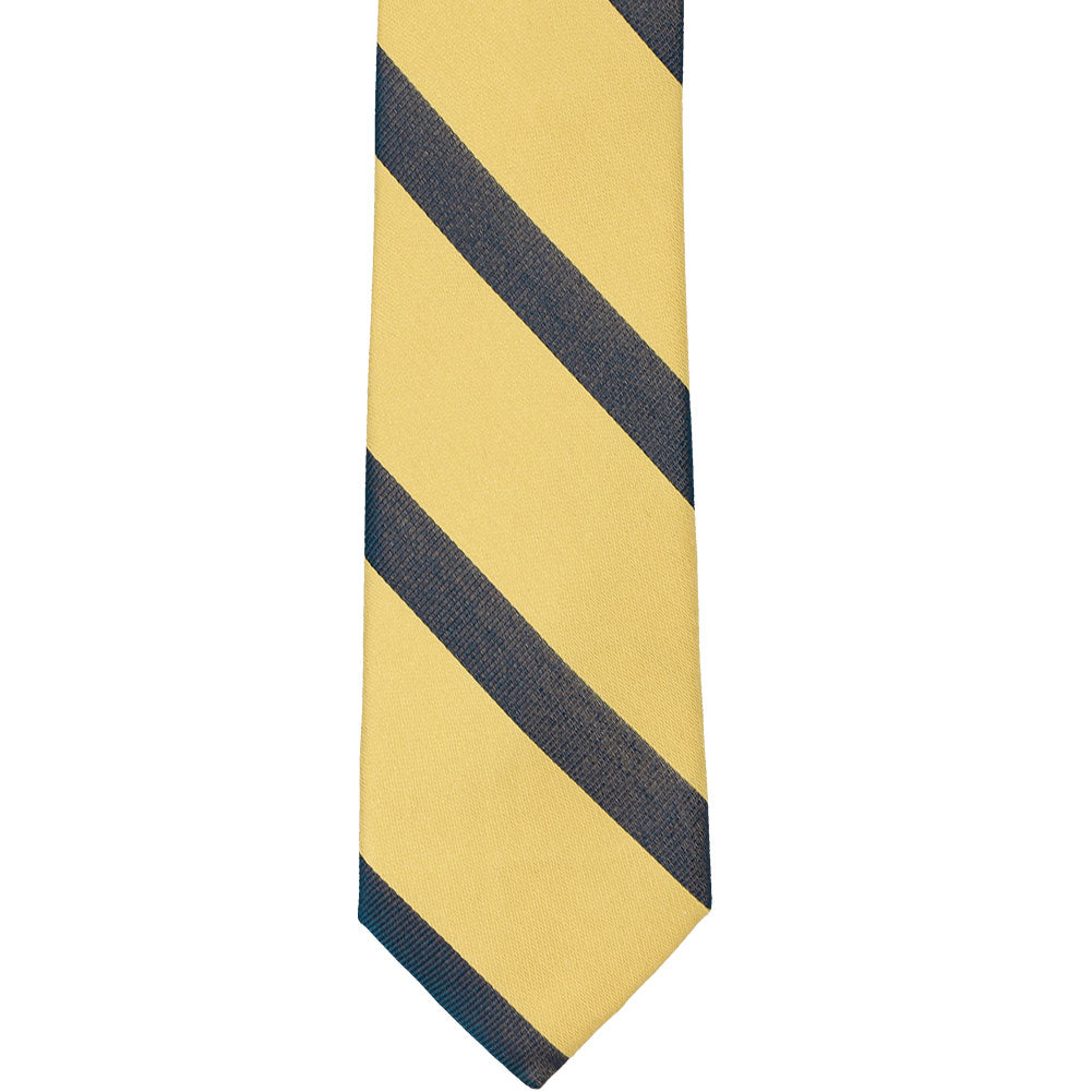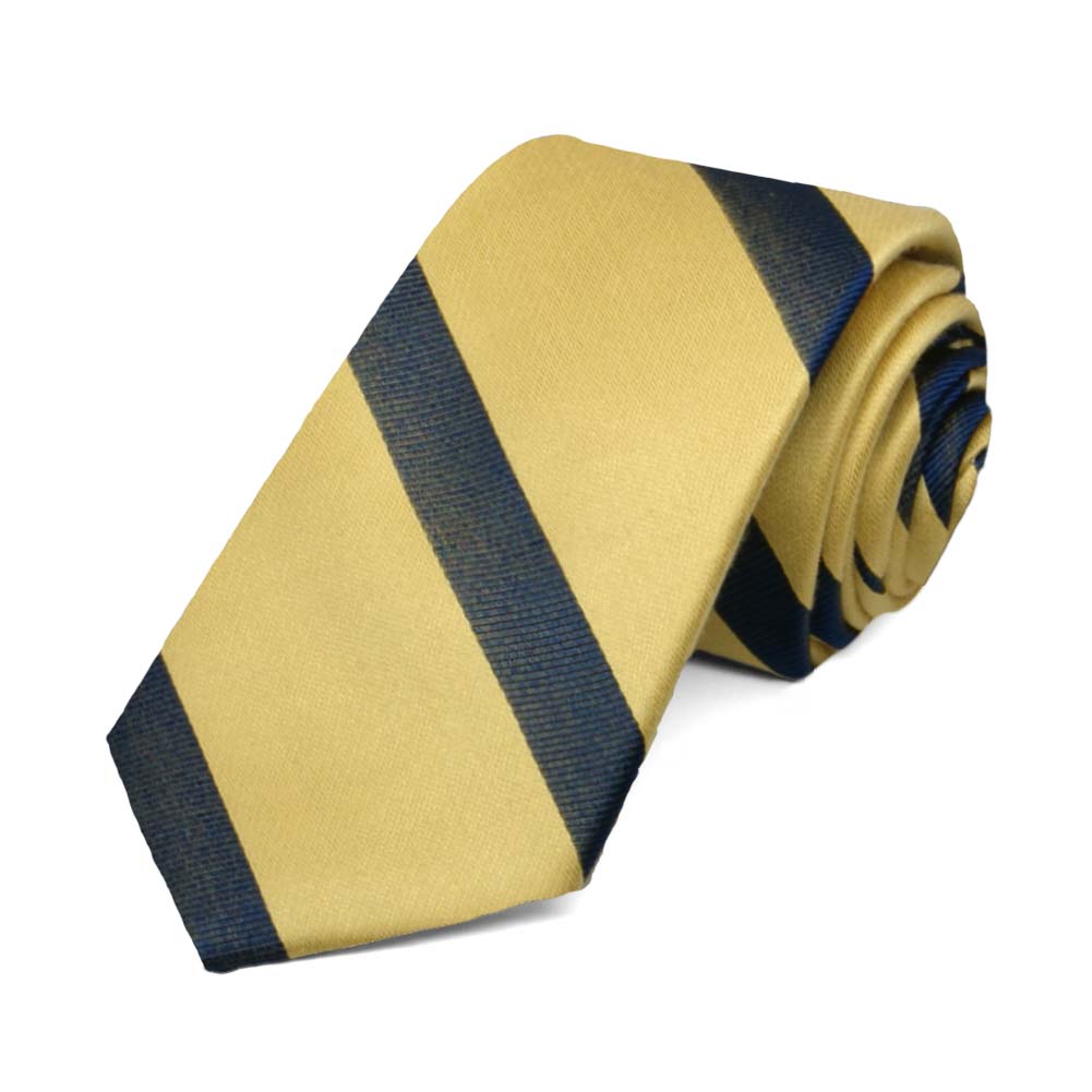 You’ll look smart and trendy in this light gold and navy blue striped slim tie. It’s the details that make it stand out, like the modern 2.5-inch width and alternating smooth and ribbed stripes. Wear it for a school uniform, to cheer on your team or to add color to your favorite navy blue suit.