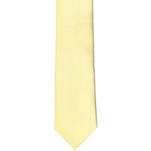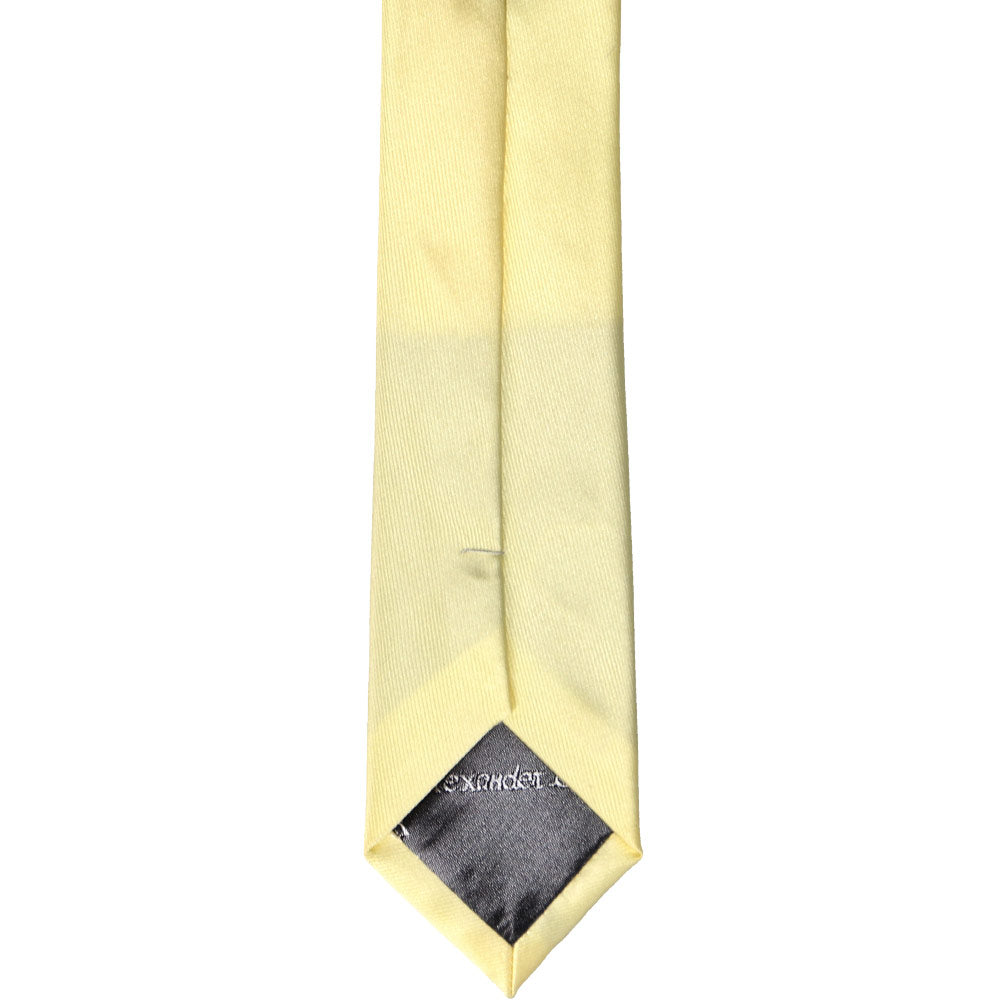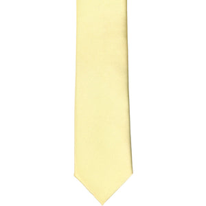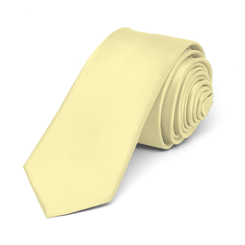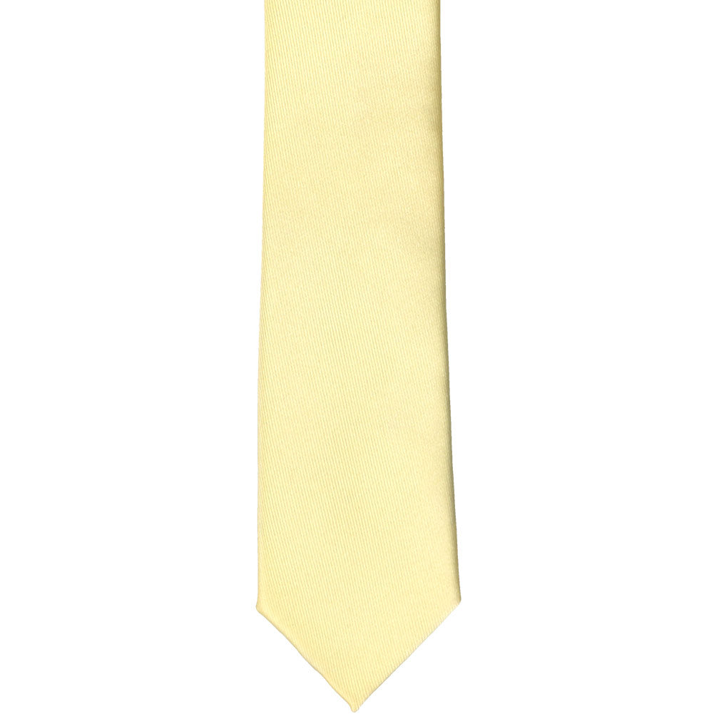 Here's a great tie to wear for trendy, warm weather occasions. Meet our light yellow skinny tie. It features our thinnest width at 2-inches wide. (Compared to a regular tie, that's about 1.5-inches thinner.) Dress it up with a fitted navy blue or gray suit, or wear it more casually with a button down and jeans.