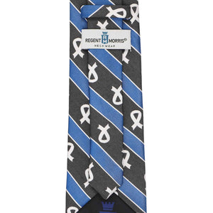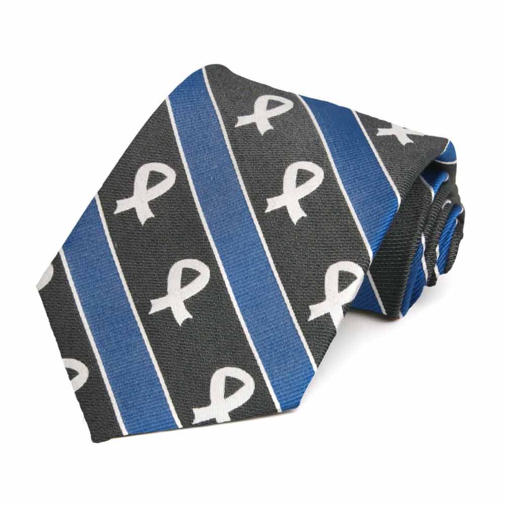 Show your support with this Lung Cancer Awareness cotton/silk necktie. It features white ribbons on a black background with blue and white ribbed stripes. Made from a heavyweight, woven blend of cotton and silk and cut to a slightly trimmed, 3.25-inch width and 57-inch length. More styles available.