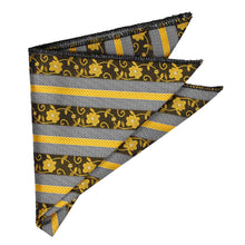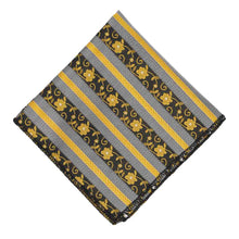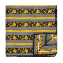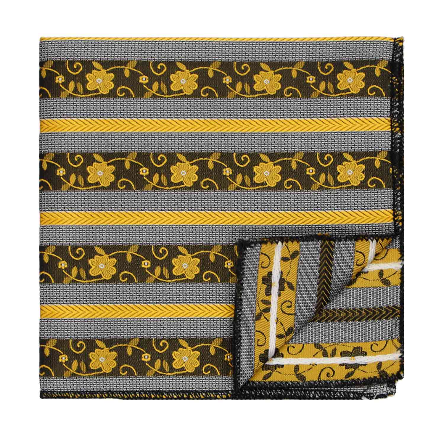 Step up your accessory game with this one-of-a-kind floral striped pocket square, featuring rich fall shades of yellow, black, and gray. Whether you're dressing for the office or a special occasion, this pocket square adds the perfect balance of boldness and sophistication to your look. Dress it up with a sharp black suit and the matching tie for a polished, refined look. Versatile, stylish, and undeniably dapper, this pocket square is the finishing touch your wardrobe needs.