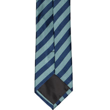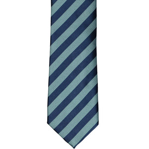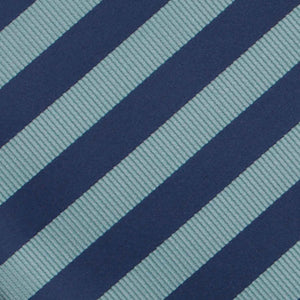 Blues are in and this striped necktie is no exception. It features alternating ribbed and satin stripes in subdued marine and teal blue. These "dusty" blue shades are one of our top picks for groomsmen attire, but rather stylish for everyday, as well. Take your pick of suits to wear with this tie. It pairs well with black, gray or, of course, navy blue. Matching pocket squares are sold separately.