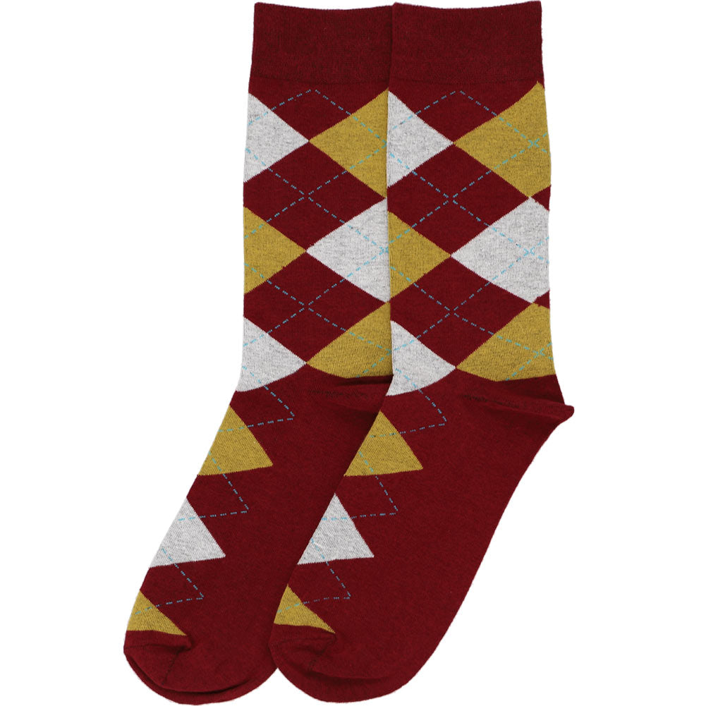 Show off your school or sports team colors in these classic argyle socks. These men's maroon socks feature a gold and gray diamond pattern with a splash of fun turquoise piping.