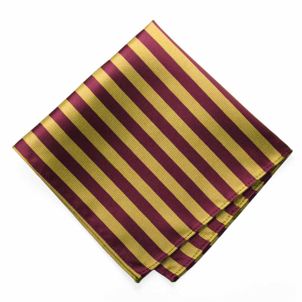 Dress up in your school or sports team colors with this elegantly styled maroon and gold striped pocket square. We designed this one for dressier occasions. The thinner stripes alternate between textured ribbing and smooth satin. The combo goes with just about any suit color. Try it with a solid color tie or the matching tie or bow tie (available for purchase).