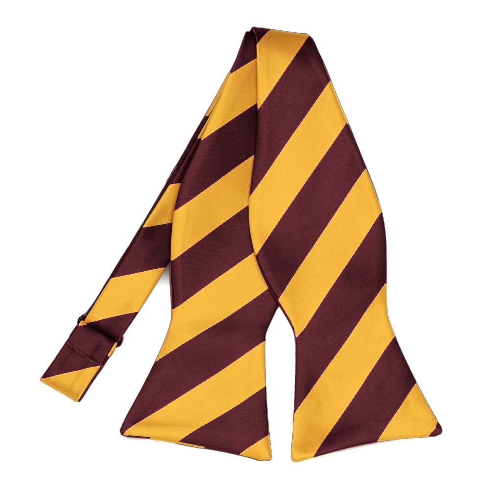 This classic maroon and golden yellow striped self-tie bow tie measures approximately 4-inches across by 2.5-inches high when tied. The adjustable neck fits sizes from 13.75 to 18-inches. Made from all polyester microfiber, it is designed to match our bestselling men's maroon and golden yellow striped tie.