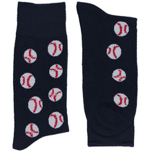 Root for your home team in these men's baseball themed socks. The cool design features multiple baseballs on a navy blue background. These socks can be worn to the office or a wedding, but he'll want to wear these while watching the game, too.