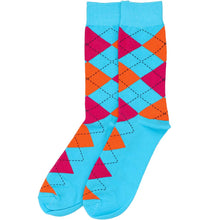 Here's what's included in this pack: 1 pair of men's turquoise and tangerine argyle socks, 1 pair of men's graphite gray and turquoise argyle socks, 1 pair of men's graphite gray and pink argyle socks, 1 pair of men's seafoam and gray argyle socks and 1 pair of men's royal blue and yellow argyle socks. (Sorry, no substitutions.)
