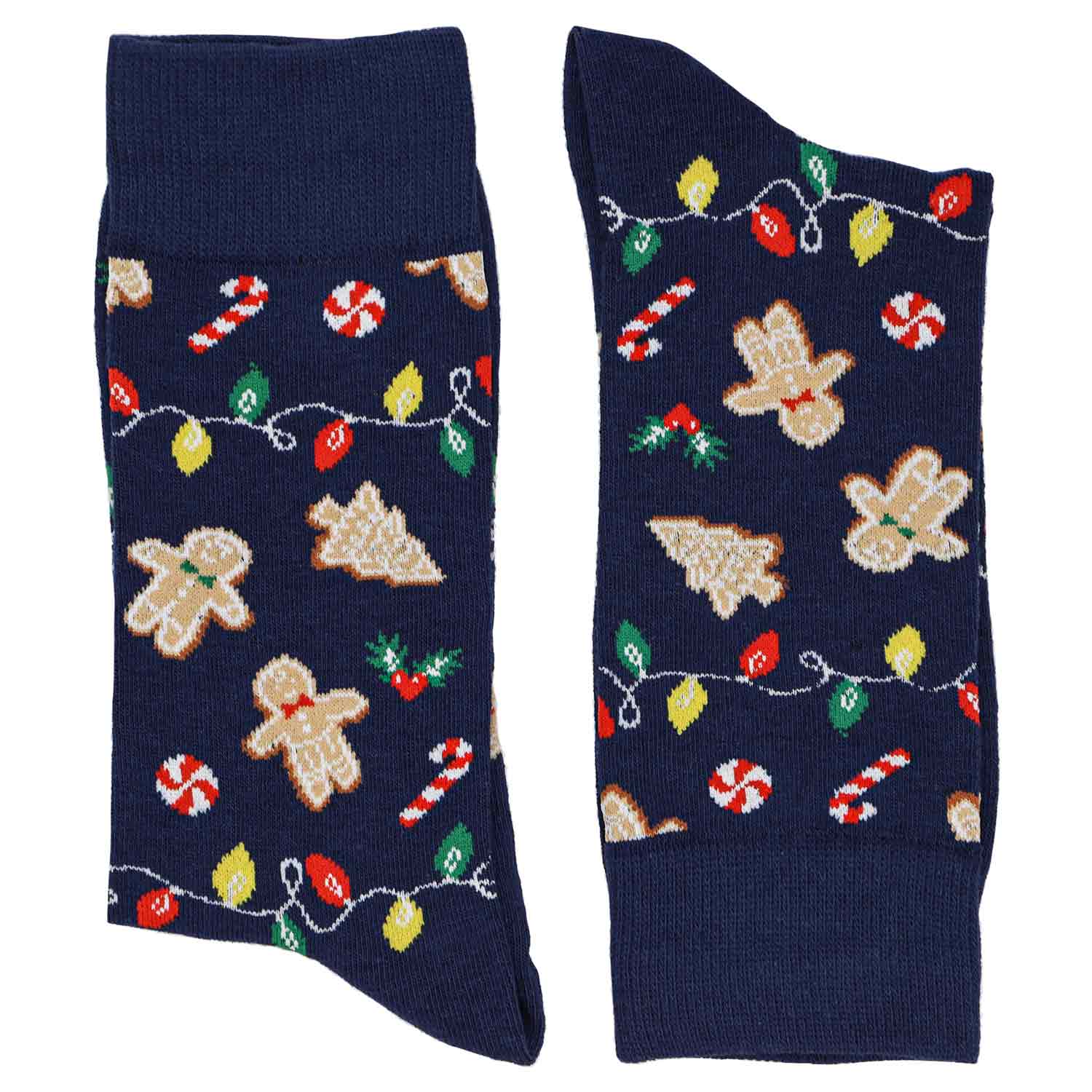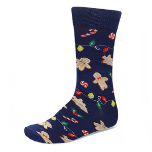 Add some spice to your step with these men's gingerbread socks. The dark blue canvas is a feast of Christmas delights, featuring cookies and peppermints that'll make your taste buds dance. But wait, there's more! We've sprinkled in a dash of holly and Christmas lights to add that extra twinkle to your toes.