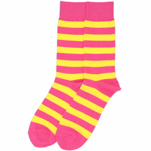 Get playful with these hot pink and yellow striped socks! This color combo is so much fun for weddings or attention-getting company uniforms. Don't be afraid to walk into the office in these socks either. Check out our hot pink and yellow striped ties for a neck-to-toe matching look.
