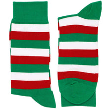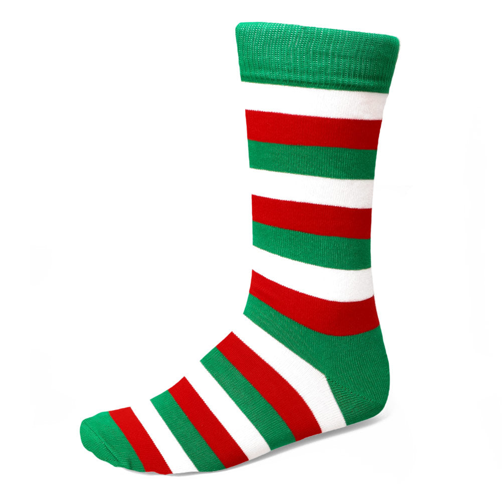 Now these are socks to celebrate in! From Christmas to Cinco de Mayo these kelly green, white and red striped socks have you covered. The horizontal stripes are bold at 0.5-inches wide. We made them to pair with our striped ties in the same striped color combination. (The stripes on the ties are a bit wider at 0.75 inches.) These are a great pair of men's dress socks to wear casually or in business settings—wherever the celebration takes you.