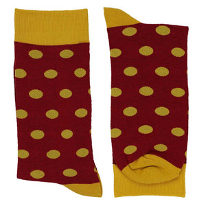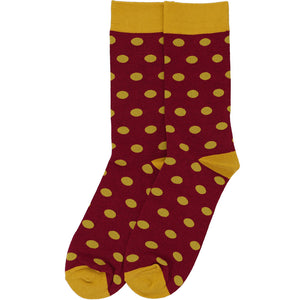 Check out these fun maroon and gold polka dot socks! While these are great dress socks to wear to work, the color combo is one of our most popular for matching school, sports team and company colors.