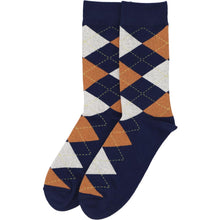 Get ready for cooler temps in these navy blue and burnt orange argyle socks. We designed these socks with fall weddings in mind. In fact, they look great worn with our burnt orange premium ties and navy blue or gray groomsmen suits. (Please note that the burnt orange in these socks is a slightly less vibrant shade compared to our burnt orange ties.)