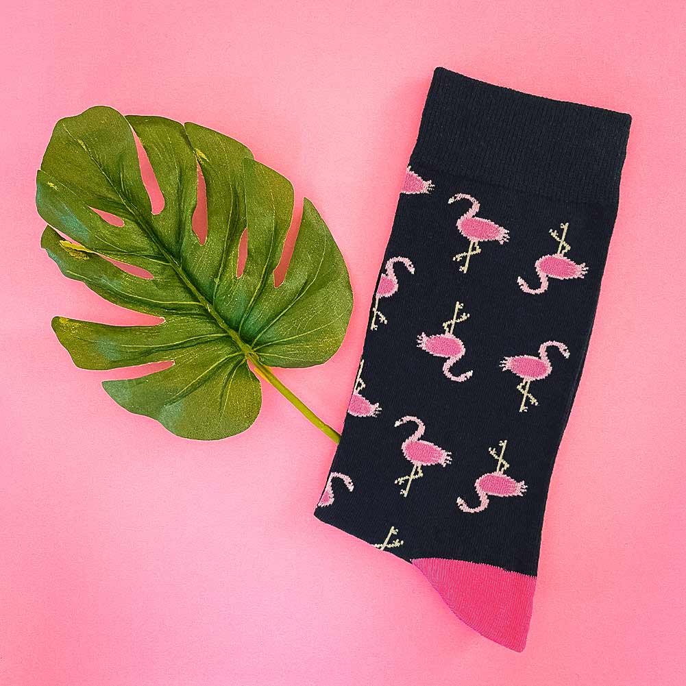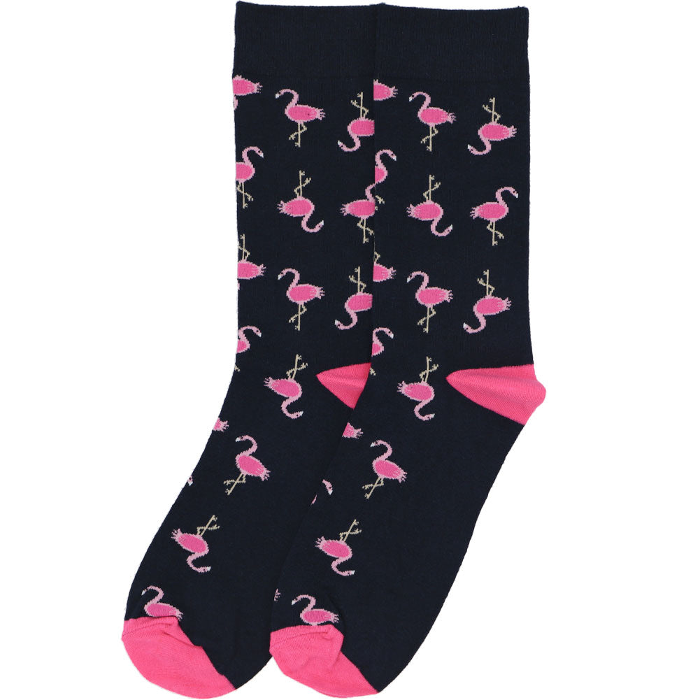 Flock the traditional dress sock and wear this fun flamingo pattern instead. Pink flamingos are scattered across these navy blue socks. For extra flair, we made the heel and toe pink to match those birds. Wear these socks to work, around the house or for a wedding.