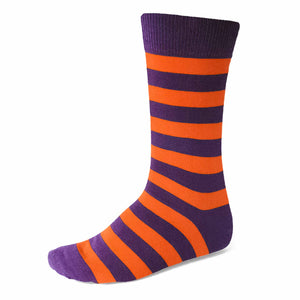 For aesthetic purposes, the stripes on the socks are slightly smaller at 0.5-inches wide, rather than the 0.75-inch stripes on the ties. (Basically, the stripes looked too wide on our feet when we sampled them in the larger stripe.) Please note that due to differences in materials, our socks are designed to coordinate with our purple and orange ties but may not be an exact match.