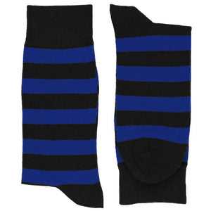 Make a bold yet classic statement with these royal blue and black striped socks. This eye-catching color combination will transition from casual to formalwear. Pair them with a black suit, school uniform or a shirt and slacks combo for a stylish look. When you're wearing a collared shirt, consider making it a set with our matching necktie. Speaking of neckties, while the stripes on the socks measure 0.5-inches wide, the ties have larger stripes at 0.75-inches.