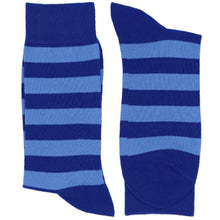 Have fun with your feet and wear these men's royal blue and blue striped socks. The all-blue color combo will turn heads at the office, or wear them to support your school or team colors. For a dressier look, try pairing them with a coordinating blue tie and a darker navy blue suit.
