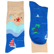 It's the perfect summer day, on your feet, in these men's seashore novelty socks. The tropical design runs the entire length of the socks, from the toes to the cuff. The scene starts with bright blue waters and sailboats galore. (Watch out though, those are shark-infested waters!) Gentle waves at the top of the socks crash onto a shell-covered beach.