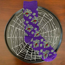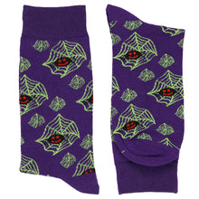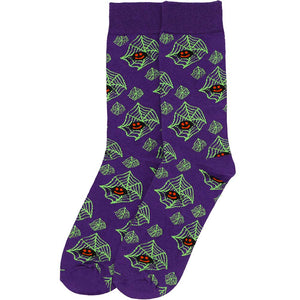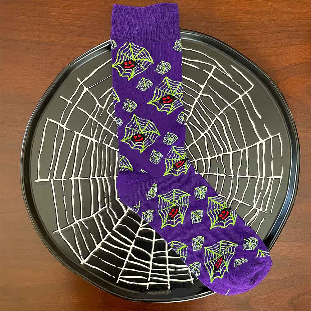Show off your Halloween spirit, on your feet! These men's dress socks feature a fun spider and web motif on a purple background. Wear these socks to work or when you're just hanging out.