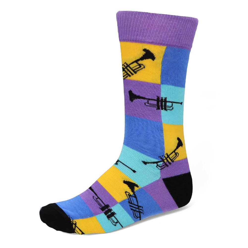 Men's trumpet-themed socks in blue, purple, black and yellow