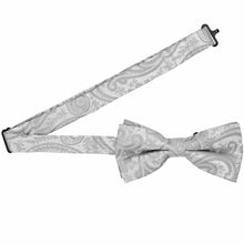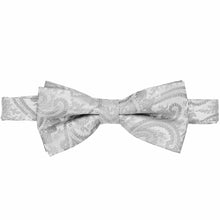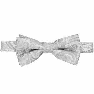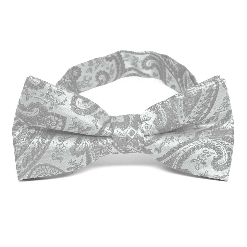 Make a statement with this mercury silver paisley bow tie. The intricate, tone-on-tone pattern is both elegant and sophisticated, striking the perfect balance between detail and design. A bestseller for weddings and formal events, it’s equally fitting for casual occasions or important business meetings. Its neutral color ensures it pairs effortlessly with nearly any suit, making it a versatile addition to your wardrobe.