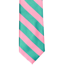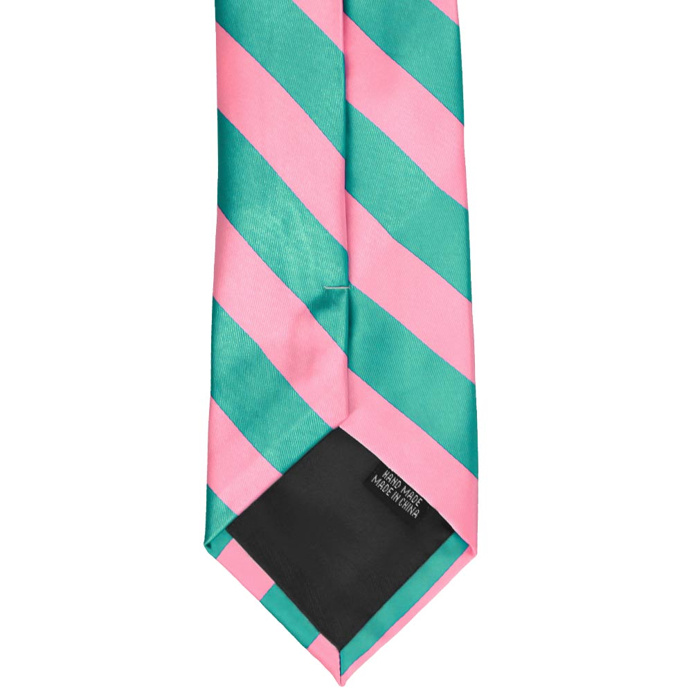 Check out the fun color combination on this striped necktie! Mermaid (a bright blue-green) blends splendidly with pink for a tropical island feel. Wear it for a classy poolside party in the summer or for a fun splash of color on your wedding day. Either way, you're sure to get noticed is this cheeky combination!