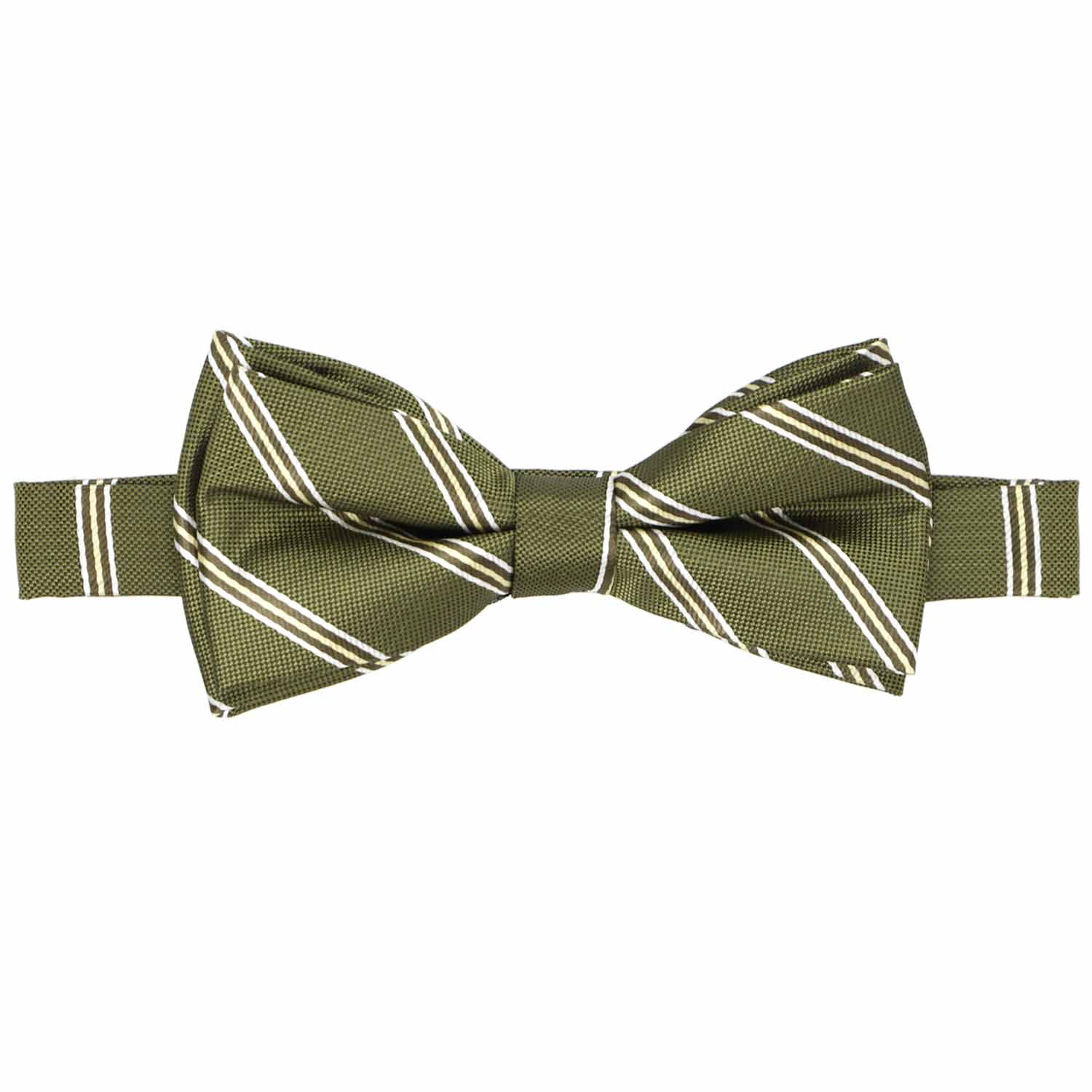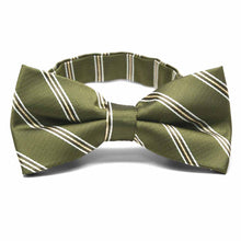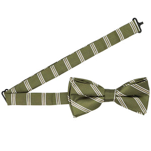Moss green and white striped bow tie, close up front view to show texture of fabric