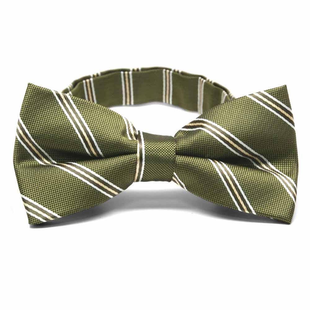 Open band collar on a moss green striped bow tie