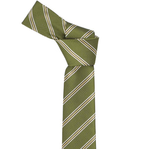 Stay stylish with this earth-toned woven tie. The moss green base, accented with white and yellow pencil stripes, and its slim width give it a modern, trendy feel. Perfect for cooler weather, it adds a polished touch peeking out from under your favorite sweater. Pair it with your go-to suit—this versatile tie complements a wide range of colors effortlessly.