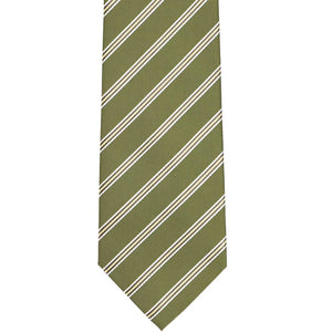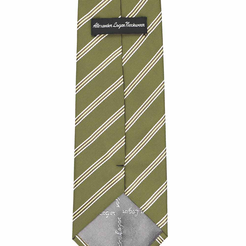 We made this tie in a size to fit the average adult, so it's a traditional, 3.5-inch width and 57-inch length. The material is a durable and medium weight polyester. Once you get your hands on it, you'll notice the textured feel thanks to the matte-like, olive green background and smooth satin pencil stripes.