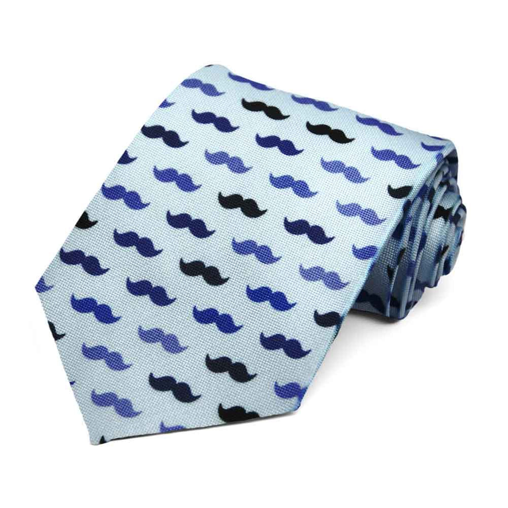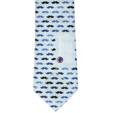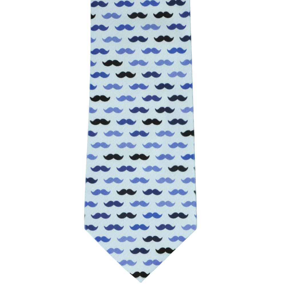 A mustache themed novelty tie in shades of blue