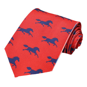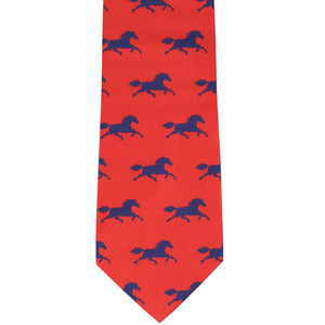 Whoa there! We're placing our bets that you'll get a kick out of this fun horse tie. The design features dark blue galloping horses on a red background. Wear it to the office or the races.