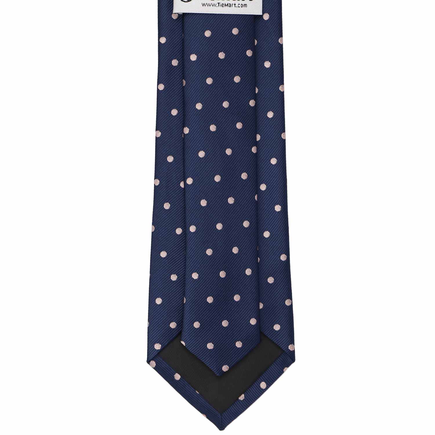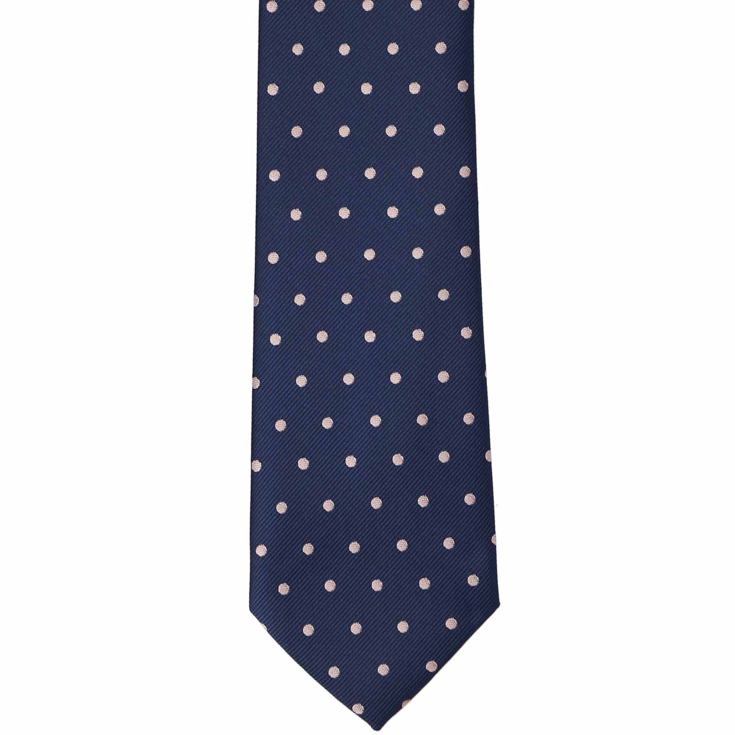 The front of a navy blue and blush pink polka dot necktie