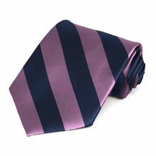 Add elegance to your wedding with this navy blue and dusty purple striped tie. The color combination has a nautical feel with a modern twist. You can't go wrong pairing this tie with black, gray, navy or even tan groomsmen suits. Complete the look with our coordinating navy blue and lavender argyle socks, sold separately.