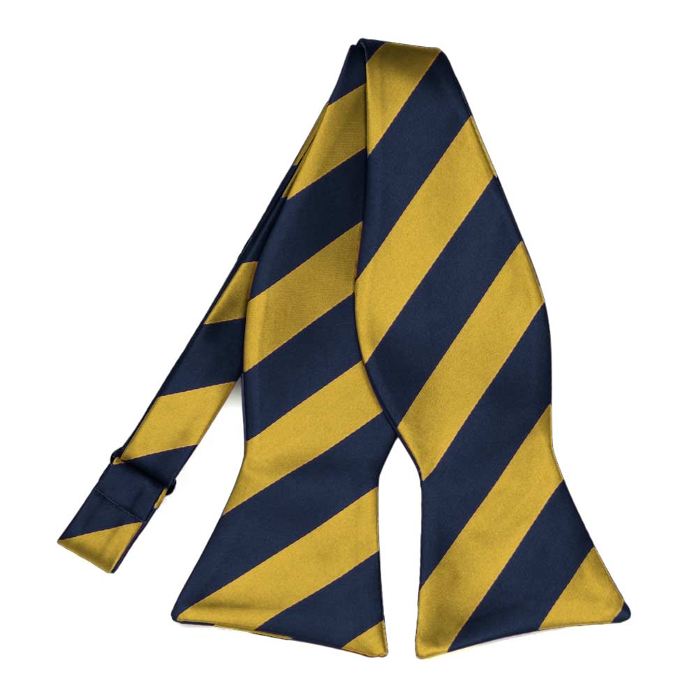 This classic navy blue and gold striped self-tie bow tie measures approximately 4-inches across by 2.5-inches high when tied. The adjustable neck fits sizes from 13.75 to 20-inches. Made from all polyester microfiber, it is designed to match our bestselling men's navy blue and gold striped tie. Matching pocket squares are available for purchase.