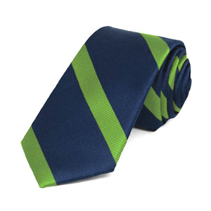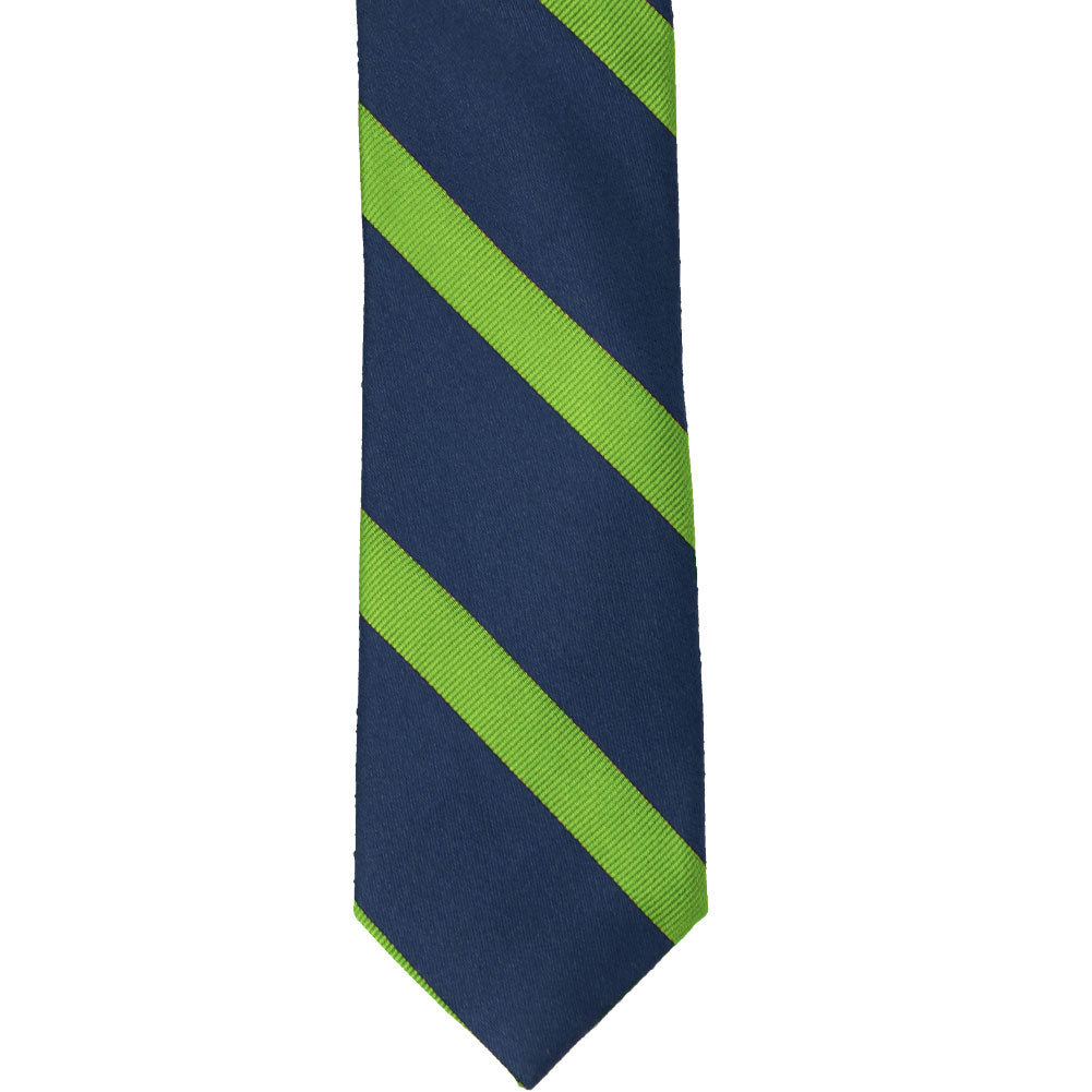 The front view of a navy blue slim tie with bright green ribbed stripes