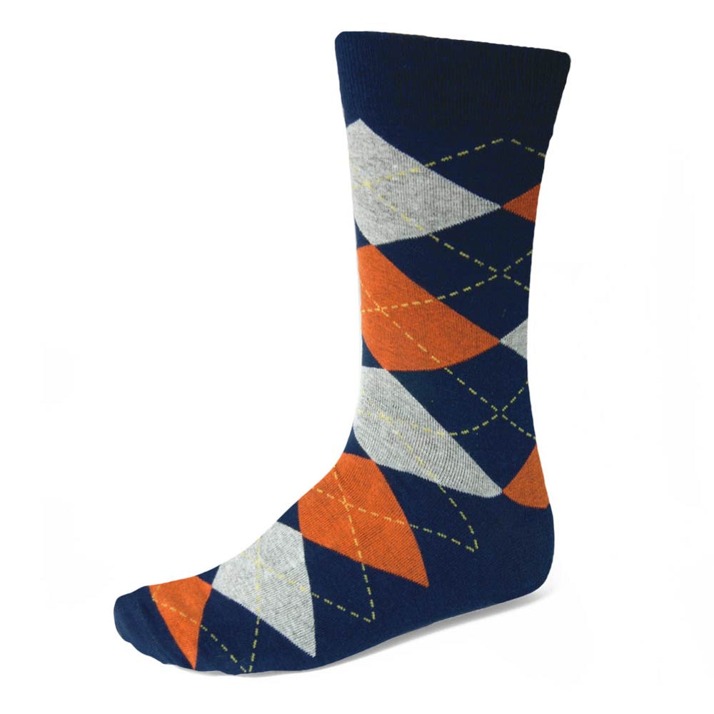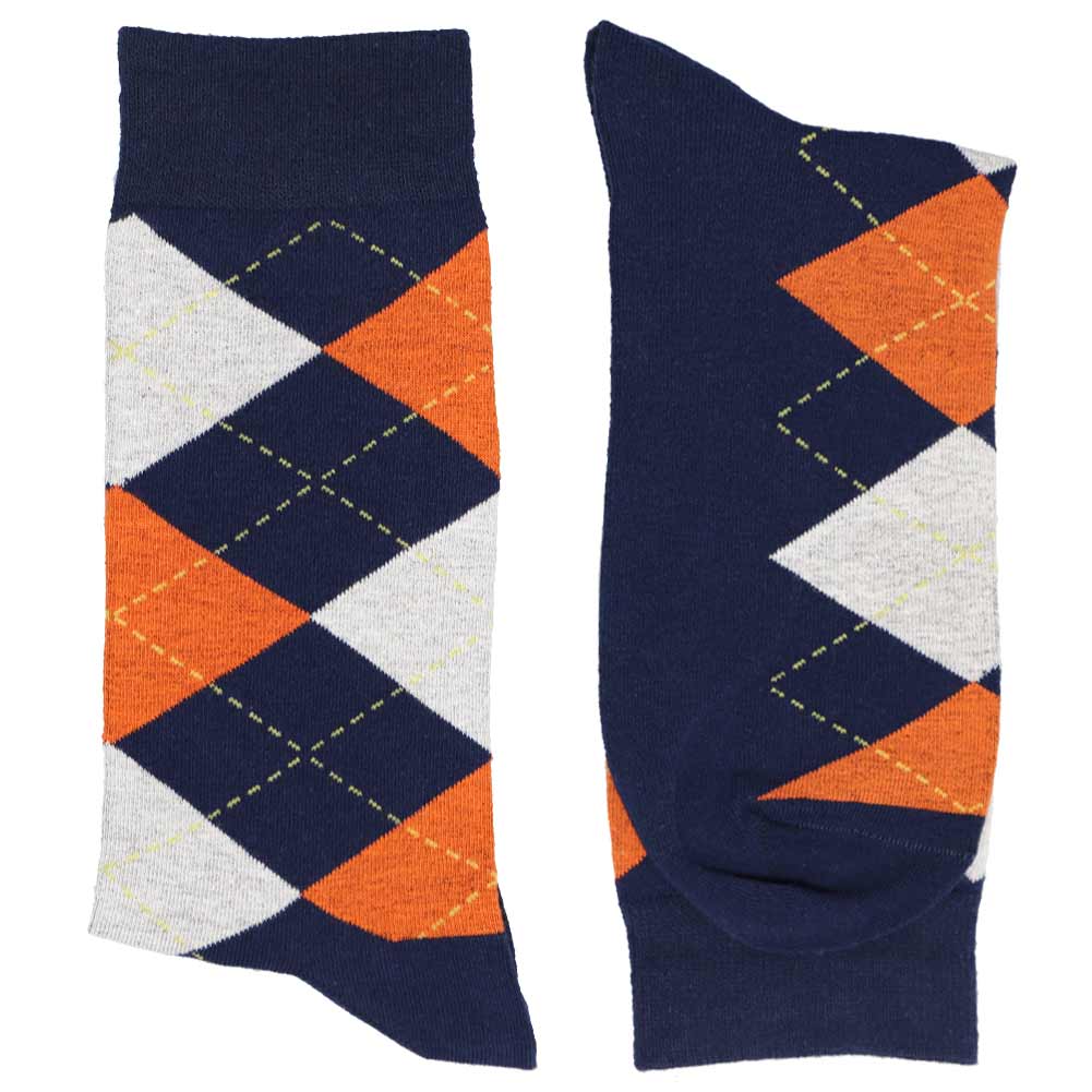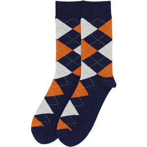 These classic navy blue and orange argyle socks are great for the office, showing off school colors or supporting your favorite sports team. The design features orange and gray diamonds on a navy blue background. Yellow piping adds a bit of flair.