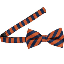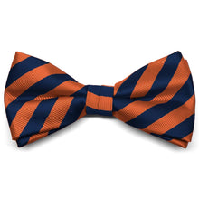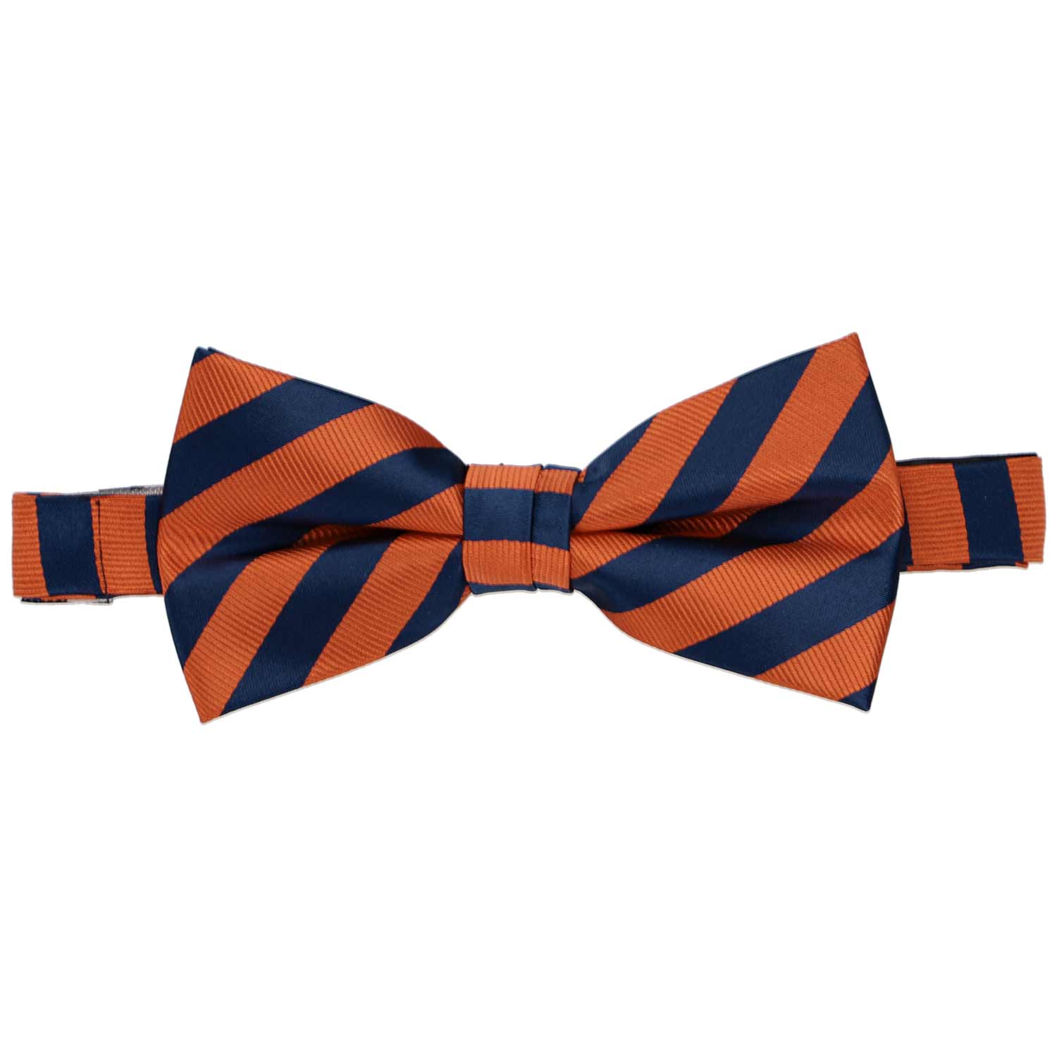 Root for the home team, or your alma mater, in this navy blue and orange striped bow tie. It's an upgrade from the average striped bow tie thanks to its alternating satin and ribbed stripes. Wear it anywhere; it's perfect for formal and casual occasions alike. For dressy events, purchase the matching pocket square for your jacket.