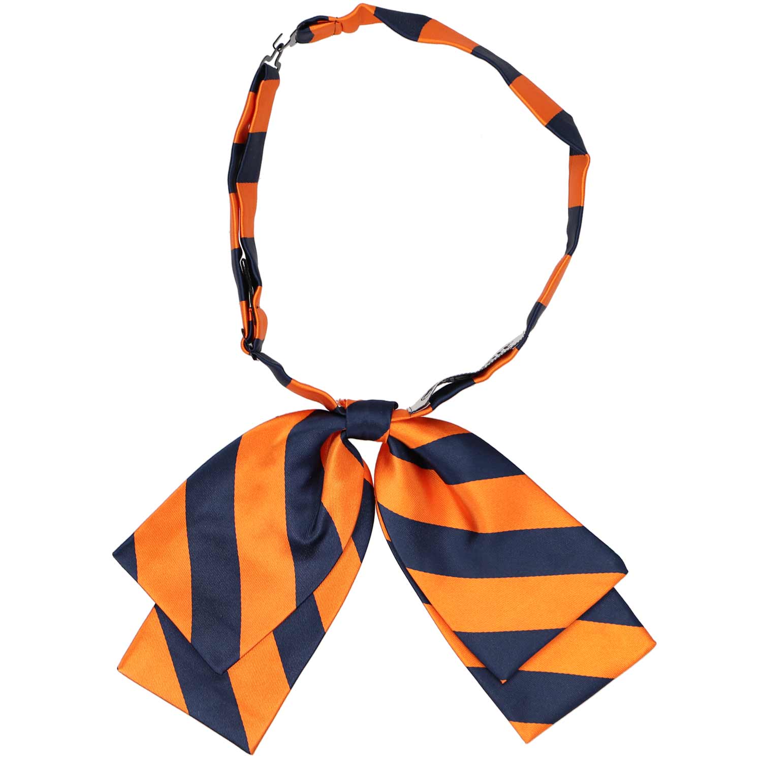 This navy blue and orange striped floppy bow tie is a great choice for school uniforms or staff attire. When worn, the bow tie extends about 5.5-inches down, so it stays out of the way from spills and stains. (So important in the food industry!)