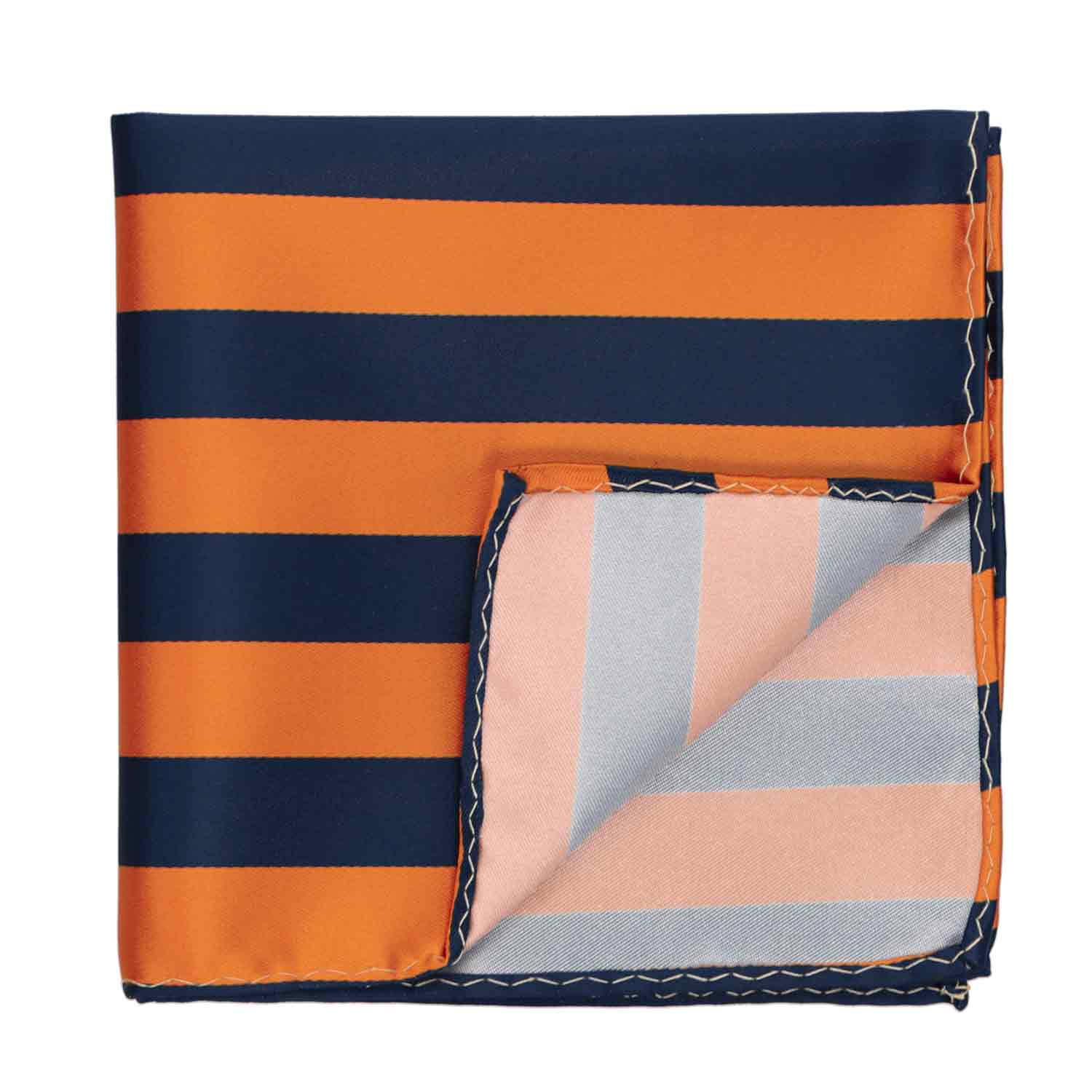 This navy blue and orange striped pocket square measures a large, 12-inches by 12-inches to suit a wide variety of folds. The tightly woven material creates a smooth finish for a sharp look. Matches our navy blue and orange striped ties and bow ties.