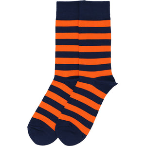 Get ready to sneak your favorite sports team or college colors into your business attire with these navy blue and orange striped socks. These men's striped dress socks feature fun horizontal stripes measuring 0.5-inches wide.