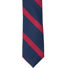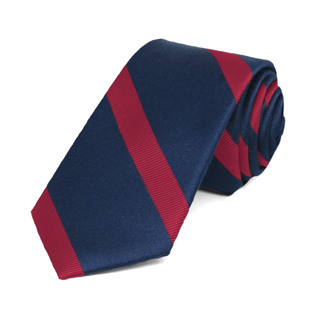 This navy blue and red striped tie is the perfect combination of sophistication and trendiness. The collegiate stripes alternate between a smooth finish and ribbed texture. However, the tie is cut in a slim width that’s about 0.75- to 1-inch skinnier than today’s traditional ties. It’s a smart choice for everyday attire, a school uniform or even a dressier event requiring a suit.