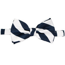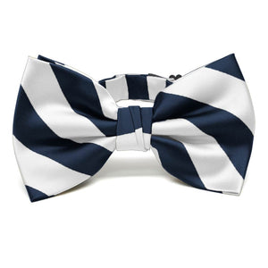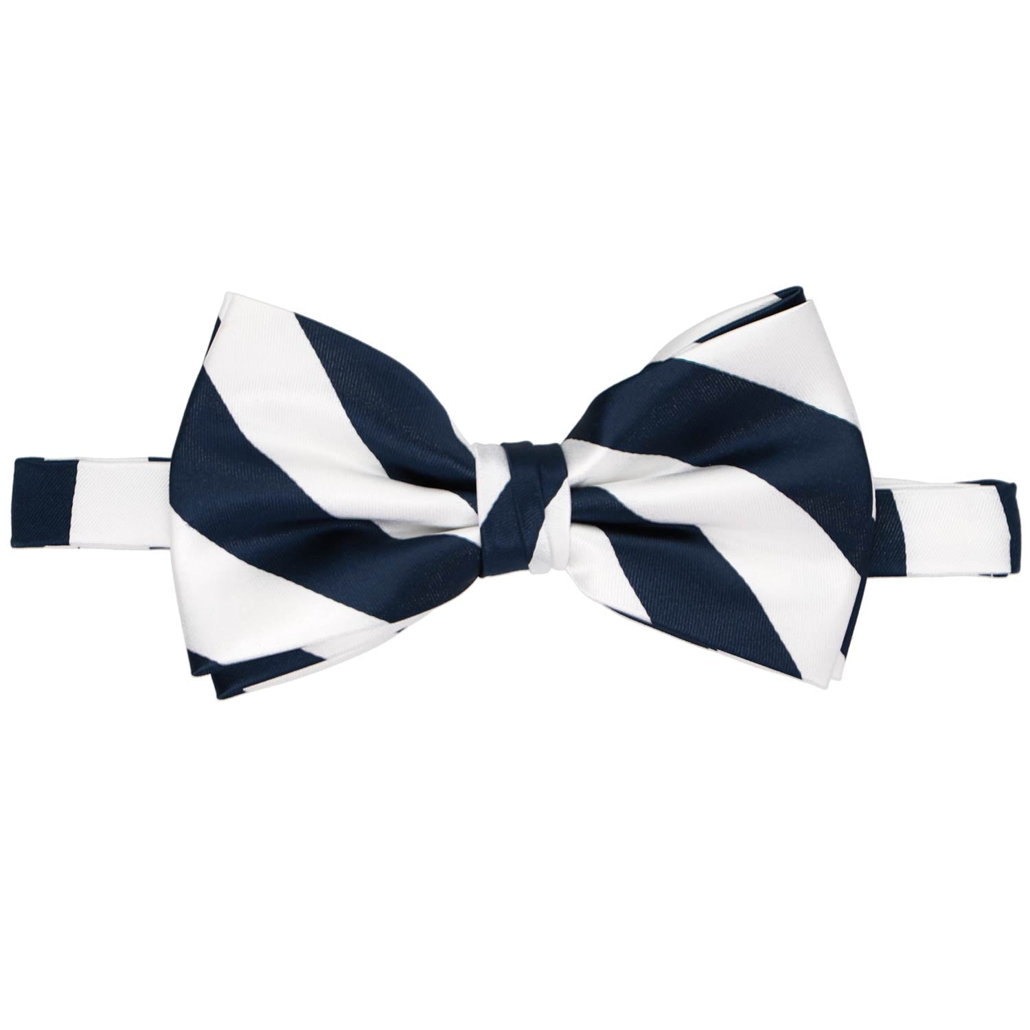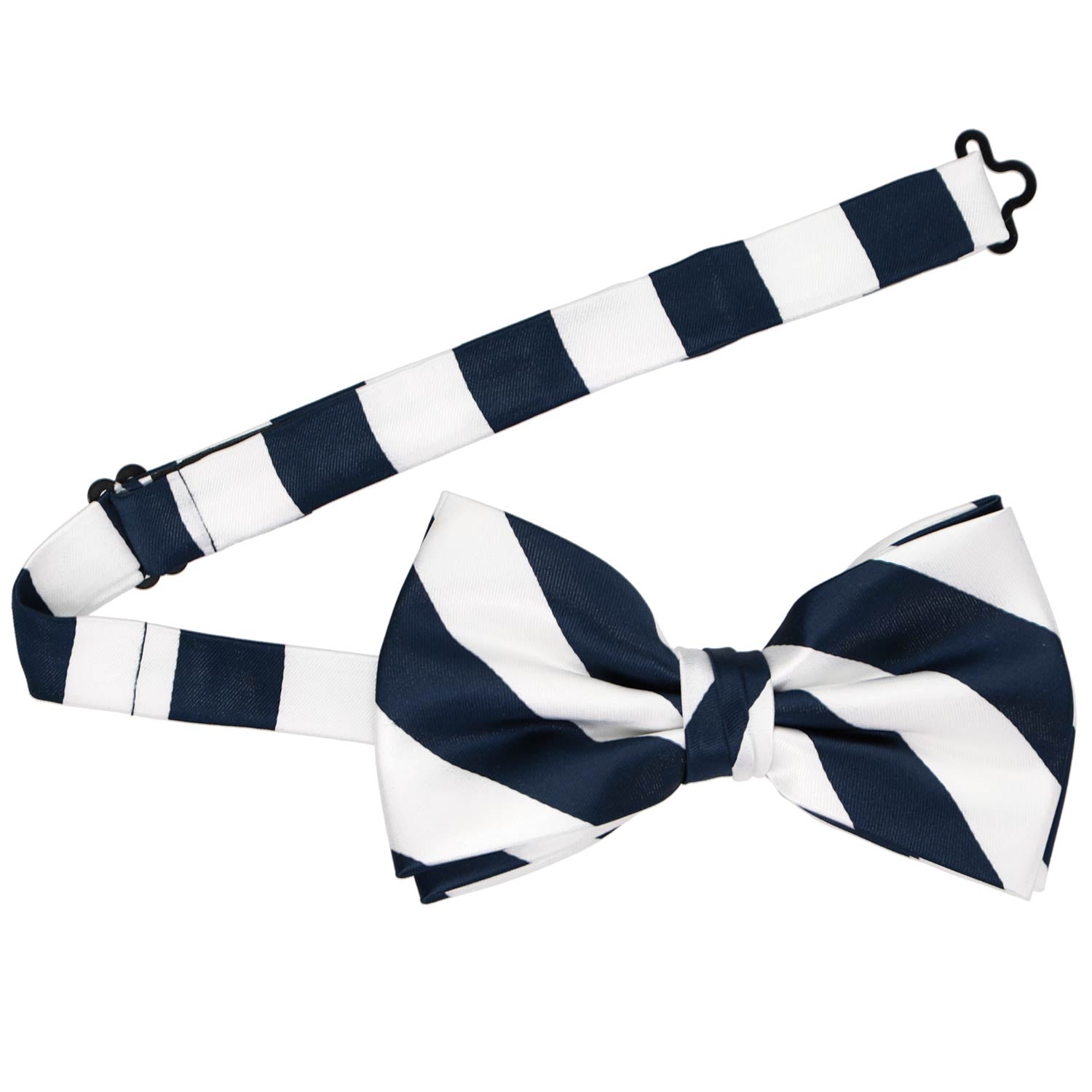 This navy blue and white striped bow tie features a pre-tied, band collar that expands to fit neck sizes up to 19-inches. Made from all polyester microfiber, it is designed to match our bestselling men's navy blue and white striped tie. Matching pocket squares and boys' sizes are available for purchase.