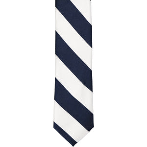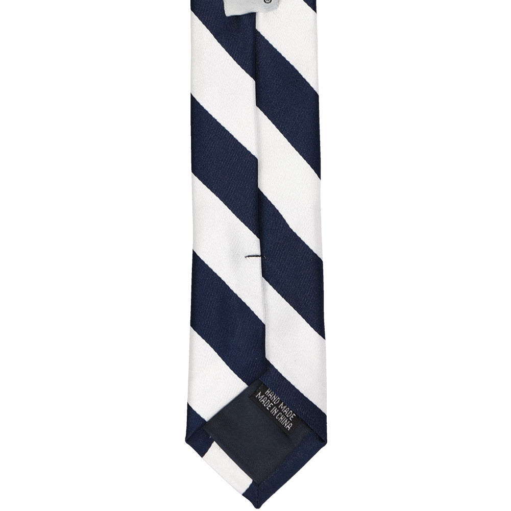 Our most popular striped ties are now available in a trendy, 2-inch width. This skinny navy blue and white striped tie is made from heavyweight woven material with a smooth, satin finish. Look for this color combo in a men's traditional-width necktie and boys' tie.