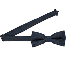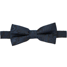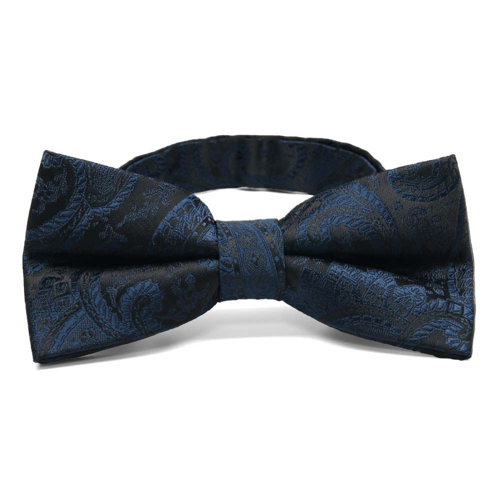 A refined, elegant look awaits with this navy blue paisley bow tie. Its large pattern is beautifully balanced by the subtle navy and black color combination, offering a sophisticated yet understated effect. Perfect for dressy occasions like weddings, it also works seamlessly in more casual settings. Pair it with a black, navy, or gray suit for a polished appearance. Add the matching pocket square (sold separately) to complete your ensemble with a touch of extra style.