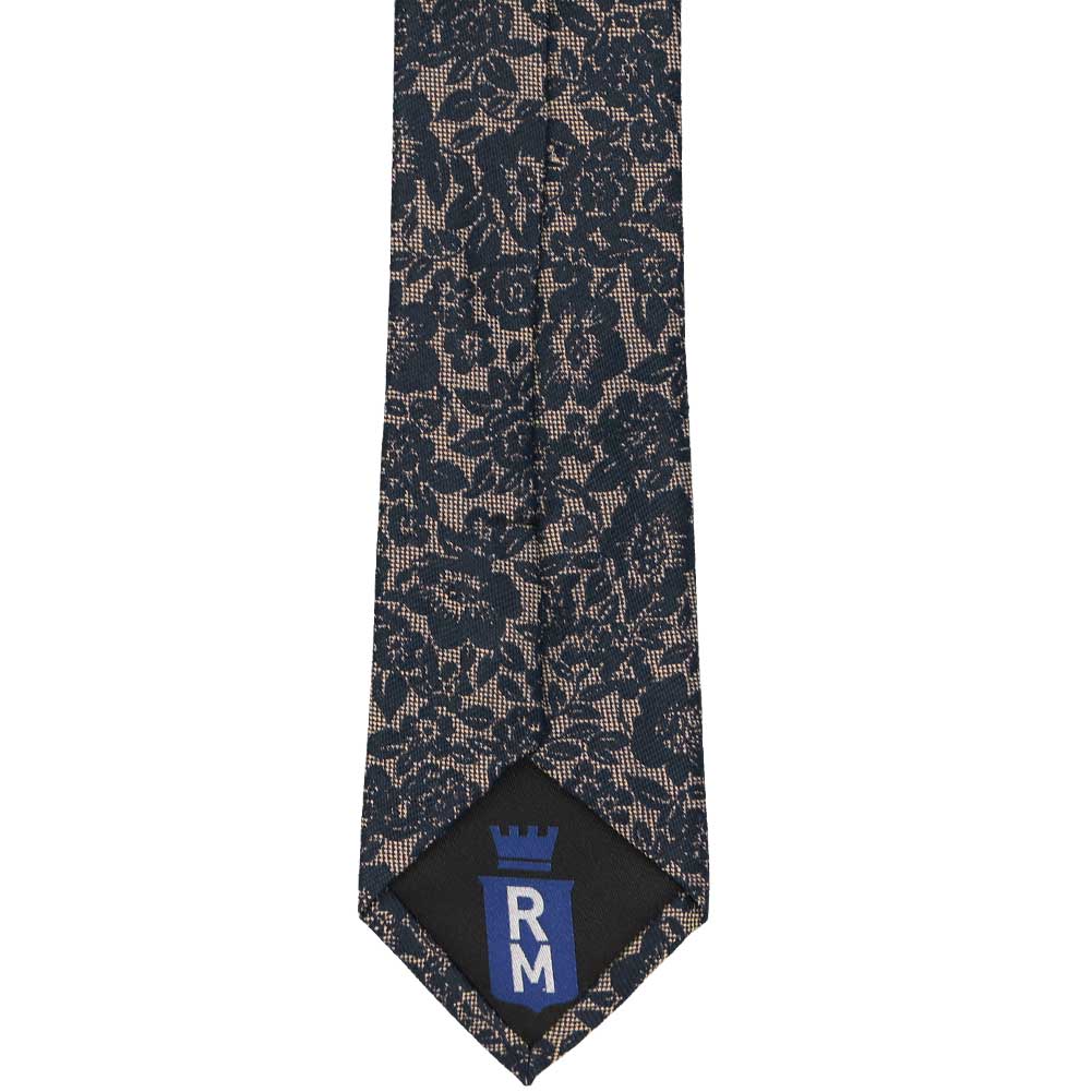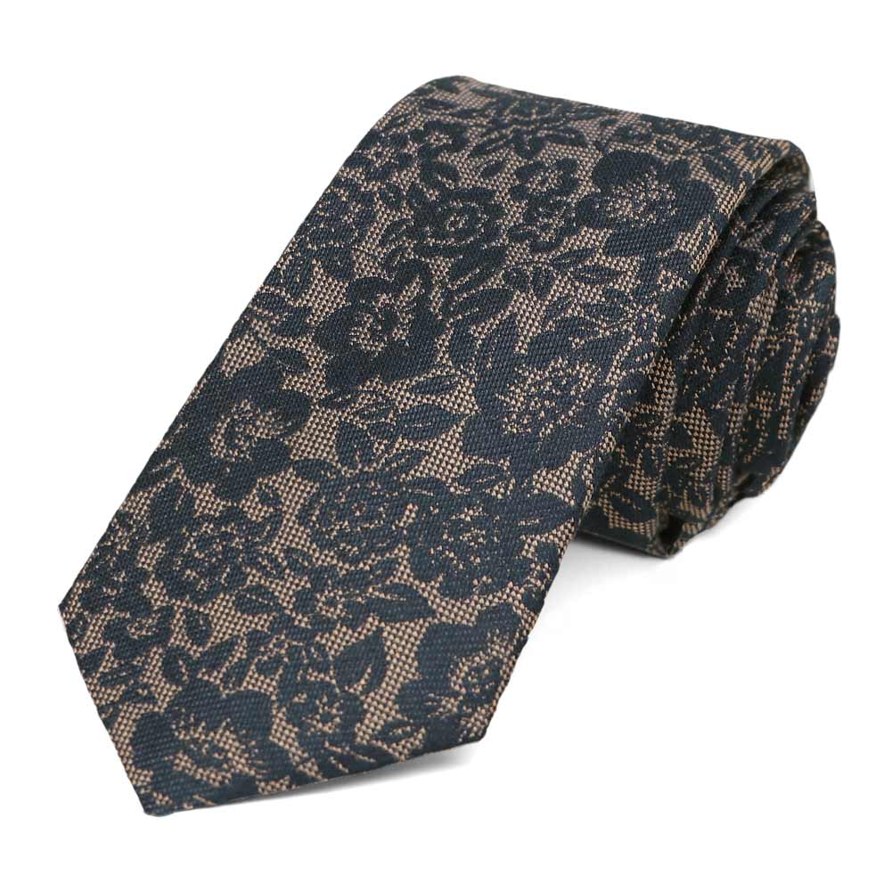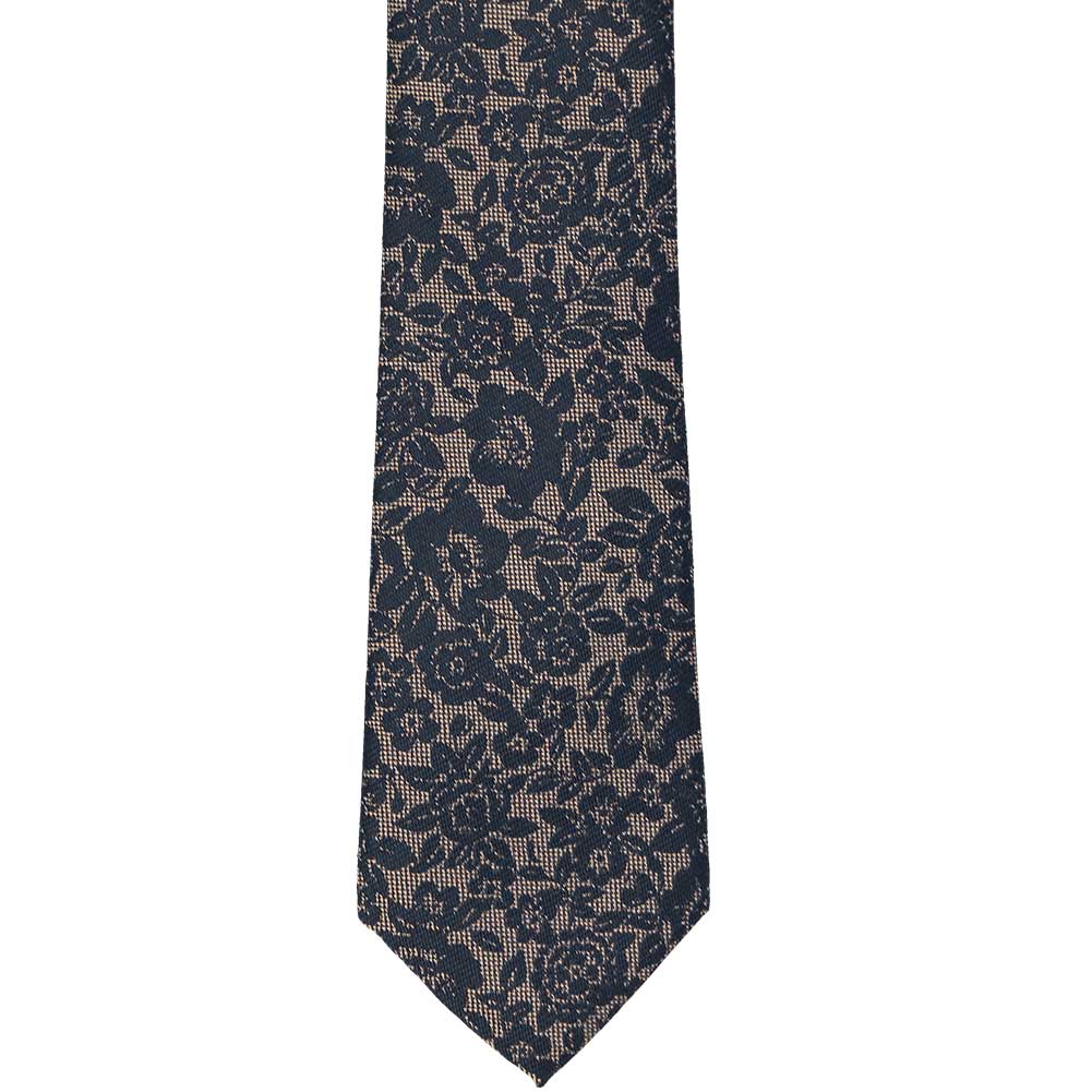 This gorgeous silk and cotton blend tie features a unique navy blue and tan floral pattern. The design reminds us of lace or burlap. This floral tie can be worn for stylish everyday or business attire. However, we've also made a matching pocket square (sold separately) so it can be used as a wedding tie, too. Try pairing it with a navy blue or tan suit.